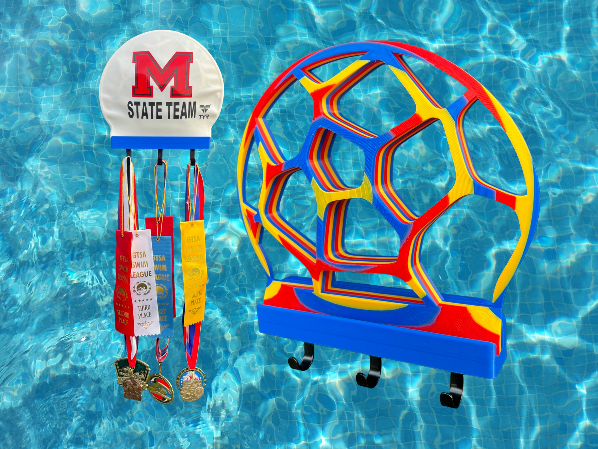 This swim cap display will hold and show off your swim cap, ribbons and medals either from an event, season or whole swim career. The three metal hooks will hold dozens of medals and hundreds of ribbons. The keyholes will hold all the weight of your awards with the included drywall hangers and screws that can be installed with just a screwdriver.